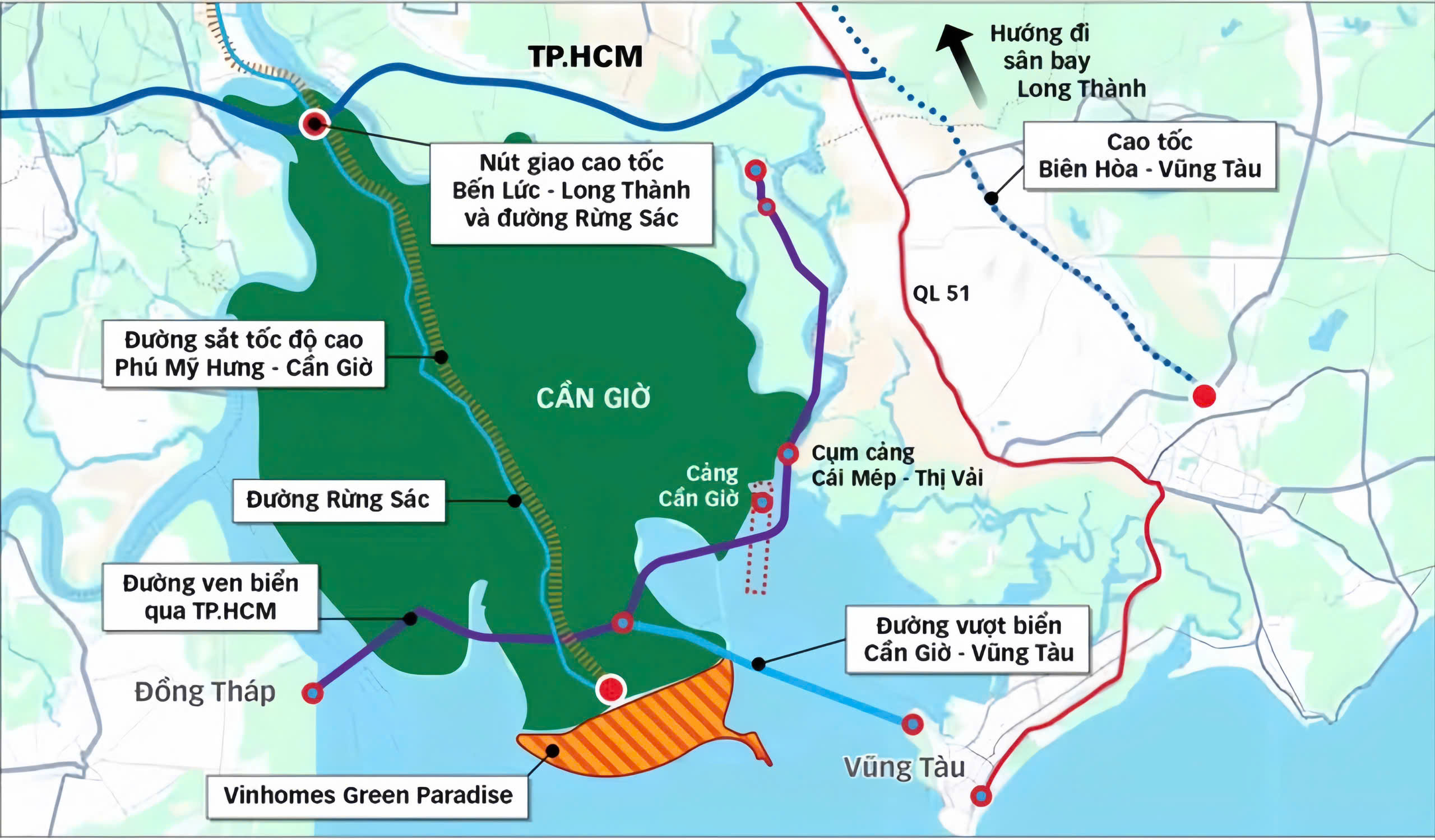 Một trong những yếu tố khiến giới đầu tư “chấm điểm 10” cho Vinhomes Green Paradise chính là tốc độ phát triển hạ tầng mạnh mẽ của khu vực Cần Giờ. Trong tương lai gần, hàng loạt công trình trọng điểm sẽ đưa khu vực này trở thành “cực tăng trưởng mới” của TP.HCM: